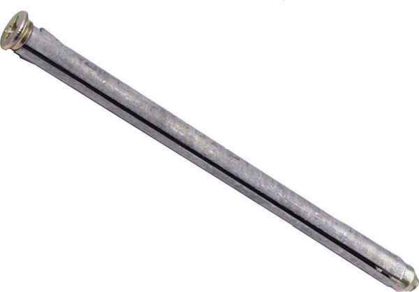 Анкер-дюбель рамный 10*202 состоит из полого оцинкованного двухраспорного штифта цилиндрической формы диаметром 10 миллиметров, оцинкованного и желтопассированного винта с метрической резьбой М8 длиной 218 миллиметров, и конического элемента с внутренней резьбой М8. При закручивании винта, конический элемент расширяет штифт, фиксируя его в основании.