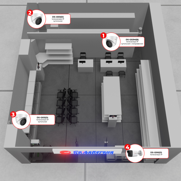 2. Бюджетная купольная 2 Мп IP-камера DS-I253M (B) с широким углом обзора и микрофоном (на схеме: № 1), оснащена ИК-подсветкой, рассчитанной на дальность до 30 метров.